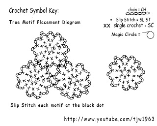 Connecting: To connect each motif, you will chain 1, SL ST to the chain on the opposite motif, CH 1, then Front Post Single Crochet. You connect to 2 chain 3 loops. Each motif is offset from the other. Depending on how you choose to put your tree together, you may be connecting 2, 4 or 6 chain 3 loops.