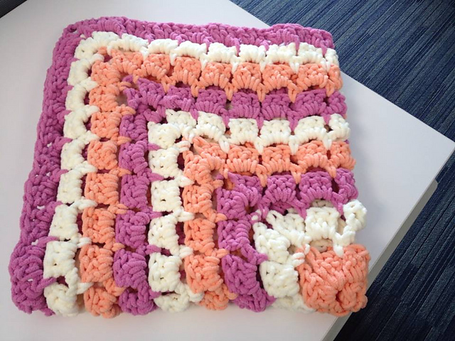 The blanket is a single, continuously expanding granny square, with colour changes at the end of every round for a striking striped effect.