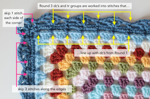 Border Round 3 Alignment: Skip 3 stitches along edges, skip 1 stitch each side of corner. DC/tr groups line up with Round 1 stitches.