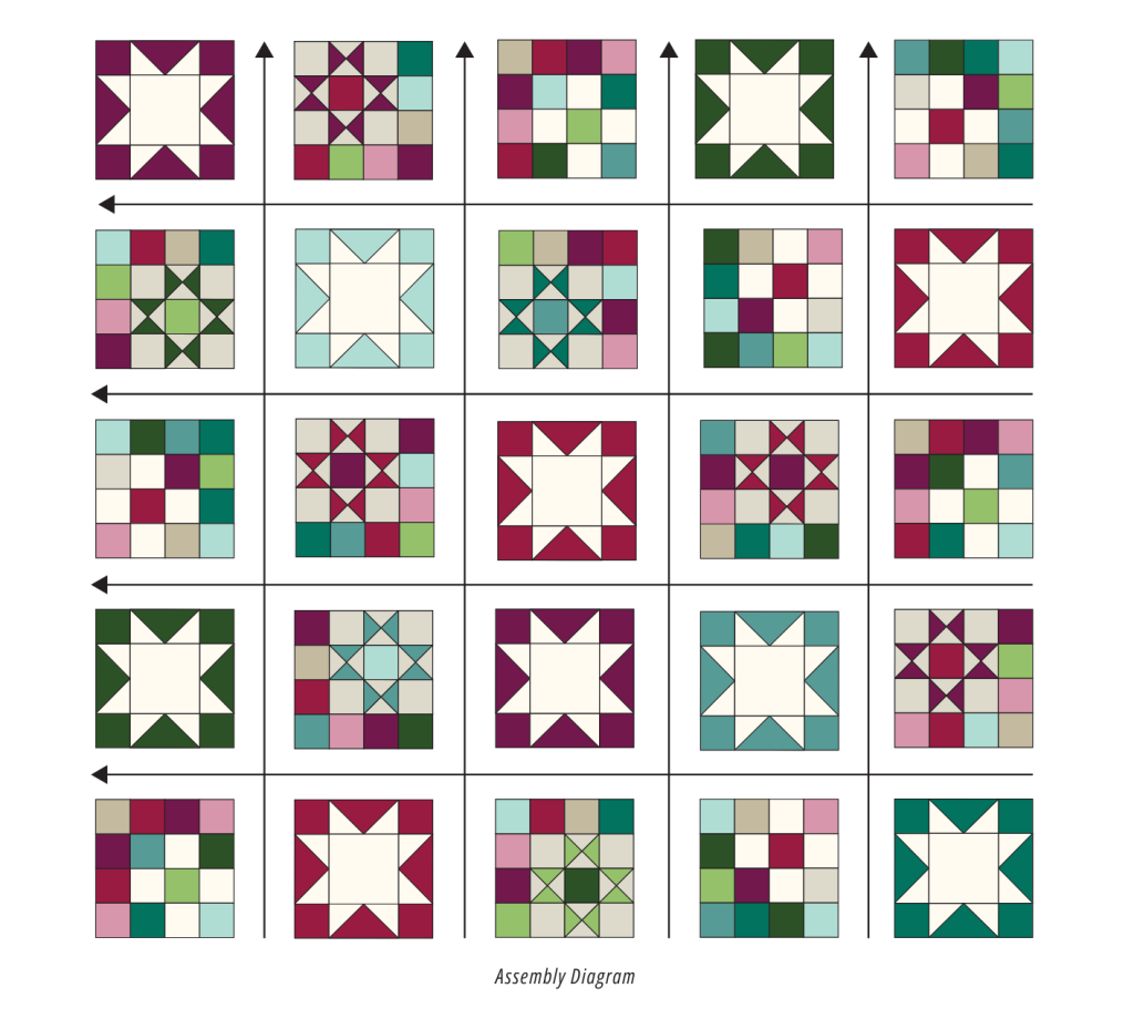 Additional squares were added on two sides of the Nine Patch and Ohio Star blocks to make them match the size of the Sawtooth Star blocks. They also add a ripple of color throughout the design.