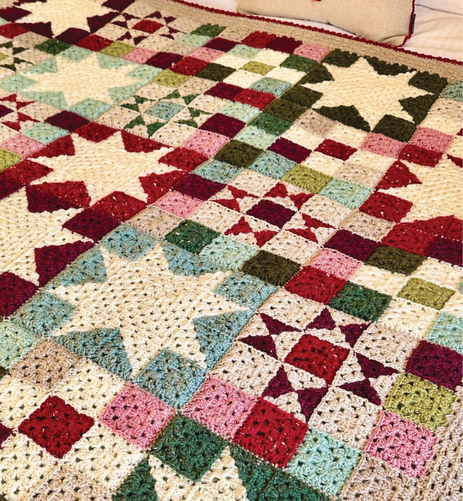 Nine Patch and Ohio Star blocks have 7 additional 3-round granny squares joined along two edges to match them to the Sawtooth Star blocks.