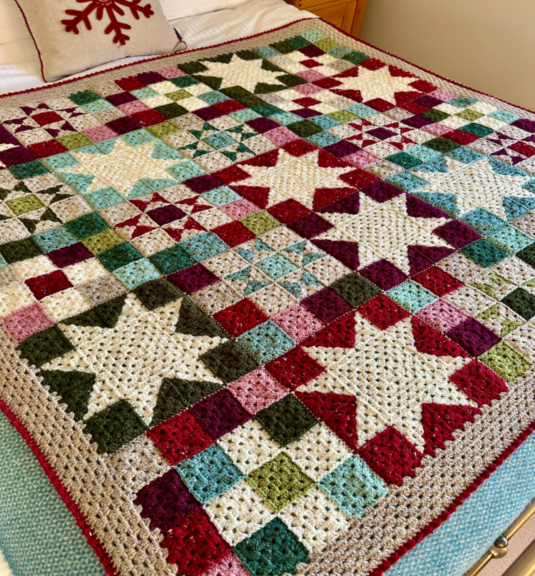 Nine Patch and Ohio Star blocks have 7 additional 3-round granny squares joined along two edges to match them to the Sawtooth Star blocks.
